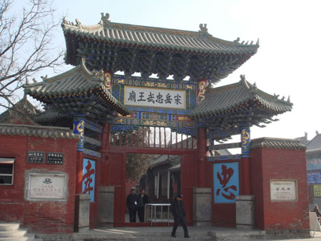 湯陰縣有許多與岳飛有關(guān)的遺址,岳飛廟就在縣城內(nèi)。岳飛廟始建年代不詳,現(xiàn)址為明景泰元年(公元1450年)重建,面積為4000多平方米,殿宇近百間。精忠坊是岳飛廟的頭間,為一座營造精美的木結(jié)構(gòu)牌樓。兩側(cè)八字墻上刻有1.8米高的兩字“忠”、“孝”。進(jìn)入門檻,便見石階下跪著五具鐵鑄像,即當(dāng)年殺害岳飛的秦檜、王氏、萬俟禹、張俊、王俊。跪像背后立一尊金銅像,怒目執(zhí)劍,對秦檜等人呈居高臨下鎮(zhèn)壓之勢。兩側(cè)楹聯(lián)上寫著: